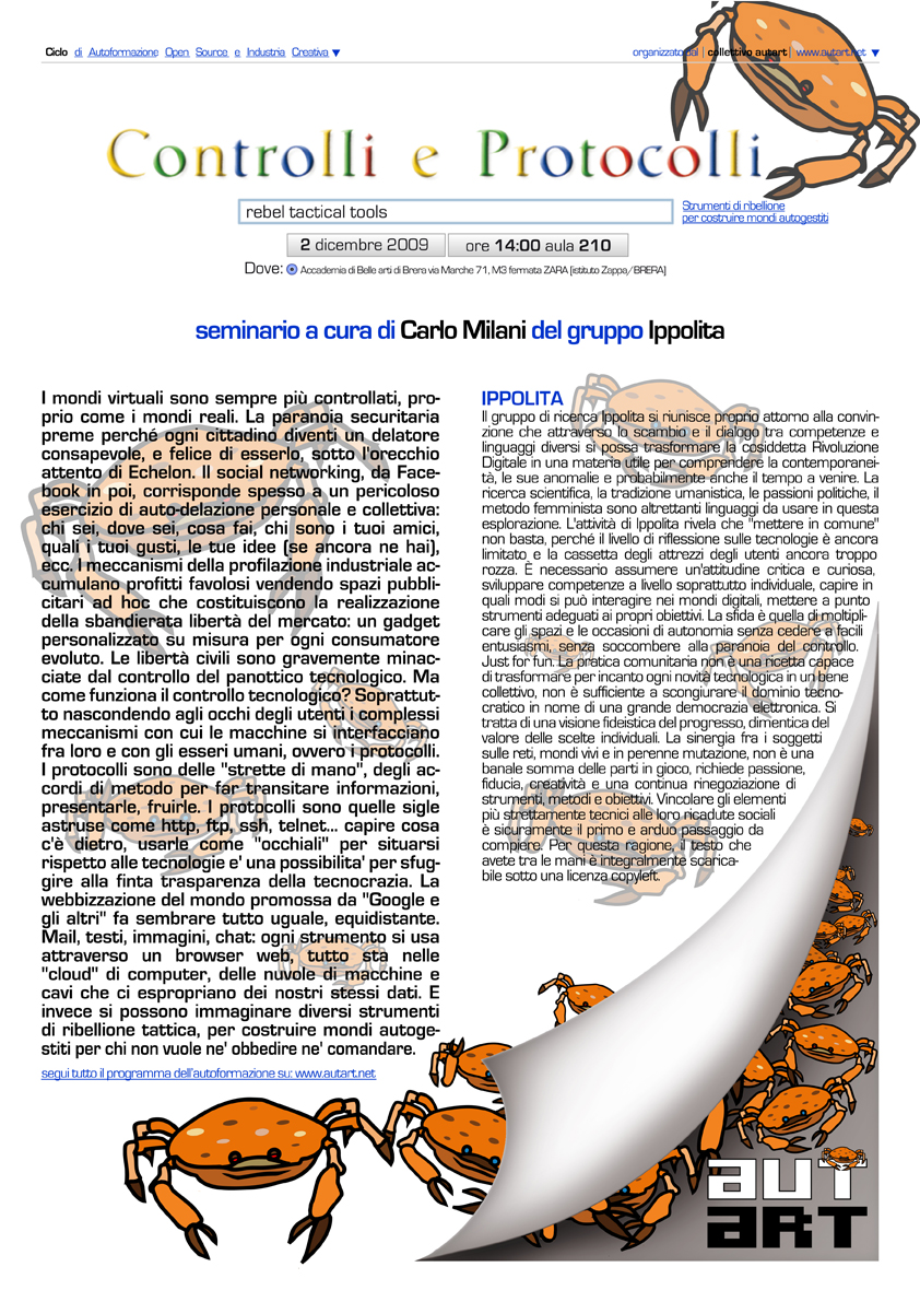 I mondi virtuali sono sempre più controllati, proprio come i mondi reali. La paranoia securitaria preme perché ogni cittadino diventi un delatore consapevole, e felice di esserlo, sotto l’orecchio attento di Echelon. Il social networking, da Facebook in poi, corrisponde spesso a un pericoloso esercizio di auto-delazione personale e collettiva: chi sei, dove sei, cosa fai, chi sono i tuoi amici, quali i tuoi gusti, le tue idee (se ancora ne hai), ecc. I meccanismi della profilazione industriale accumulano profitti favolosi vendendo spazi pubblicitari ad hoc che costituiscono la realizzazione della sbandierata libertà del mercato: un gadget personalizzato su misura per ogni consumatore evoluto. Le libertà civili sono gravemente minacciate dal controllo del panottico tecnologico. Ma come funziona il controllo tecnologico? Soprattutto nascondendo agli occhi degli utenti i complessi meccanismi con cui le macchine si interfacciano fra loro e con gli esseri umani, ovvero i protocolli. I protocolli sono delle “strette di mano”, degli accordi di metodo per far transitare informazioni, presentarle, fruirle. I protocolli sono quelle sigle astruse come http, ftp, ssh, telnet… capire cosa c’è dietro, usarle come “occhiali” per situarsi rispetto alle tecnologie e’ una possibilita’ per sfuggire alla finta trasparenza della tecnocrazia. La webbizzazione del mondo promossa da “Google e gli altri” fa sembrare tutto uguale, equidistante. Mail, testi, immagini, chat: ogni strumento si usa attraverso un browser web, tutto sta nelle “cloud” di computer, delle nuvole di macchine e cavi che ci espropriano dei nostri stessi dati. E invece si possono immaginare diversi strumenti di ribellione tattica, per costruire mondi autogestiti per chi non vuole ne’ obbedire ne’ comandare.