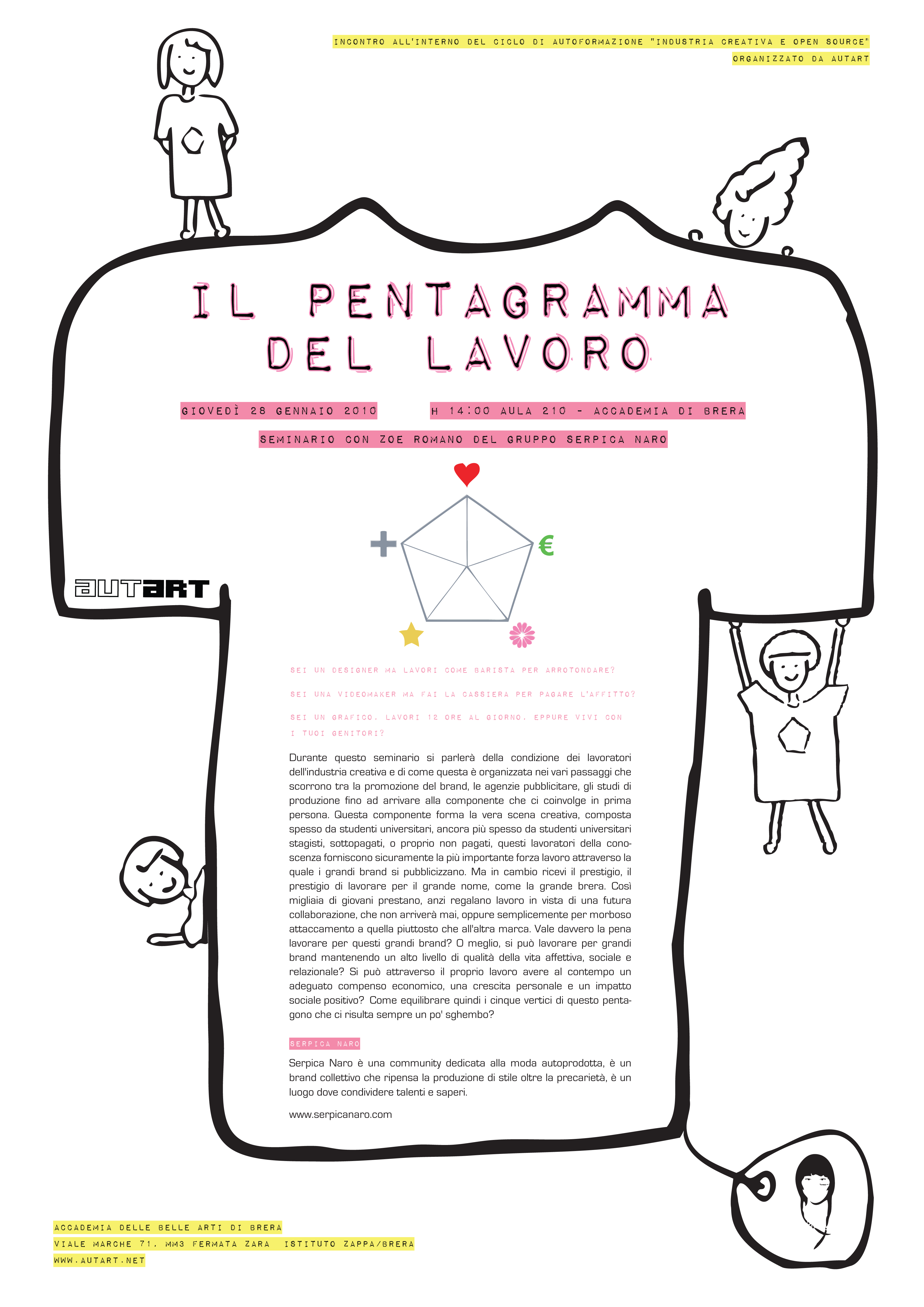 Durante questo seminario si parlerà della condizione dei lavoratori dell’industria creativa e di come questa è organizzata nei vari passaggi che scorrono tra la promozione del brand, le agenzie pubblicitare, gli studi di produzione fino ad arrivare alla componente che ci coinvolge in prima persona. Questa componente forma la vera scena creativa, composta spesso da studenti universitari, ancora più spesso da studenti universitari stagisti, sottopagati, o proprio non pagati, questi lavoratori della conoscenza forniscono sicuramente la più importante forza lavoro attraverso la quale i grandi brand si pubblicizzano. Ma in cambio ricevi il prestigio, il prestigio di lavorare per il grande nome, come la grande brera. Così migliaia di giovani prestano, anzi regalano lavoro in vista di una futura collaborazione, che non arriverà mai, oppure semplicemente per morboso attaccamento a quella piuttosto che all’altra marca. Vale davvero la pena lavorare per questi grandi brand? O meglio, si può lavorare per grandi brand mantenendo un alto livello di qualità della vita affettiva, sociale e relazionale? Si può attraverso il proprio lavoro avere al contempo un adeguato compenso economico, una crescita personale e un impatto sociale positivo?
