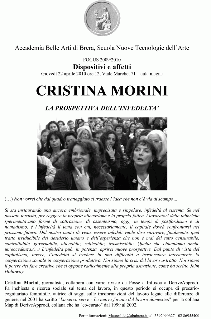 Cristina Morini, giornalista, collabora con varie riviste da Posse a Infoxoa a DeriveApprodi. Fa inchiesta e ricerca sociale sul tema del lavoro, in questo periodo si occupa di precario-cognitariato femminile. autrice di saggi sulle trasformazioni del lavoro legate alle differenze di genere, nel 2001 ha scritto “La serva serve – Le nuove forzate del lavoro domestico” per la collana Map di DeriveApprodi, collana che ha “co-curato” dal 1999 al 2002.
