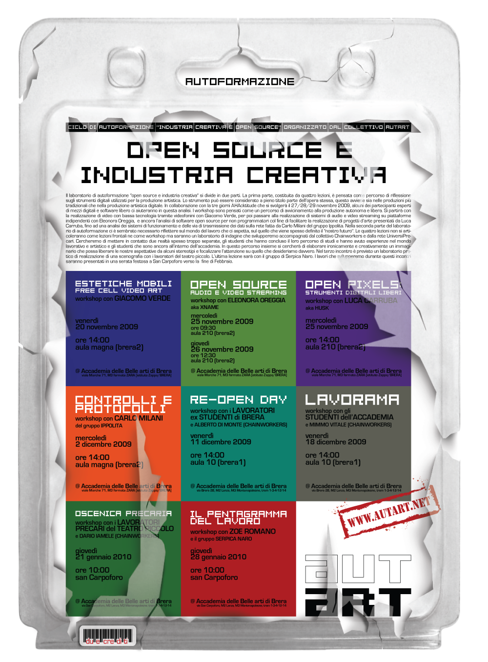 Il laboratorio di autoformazione “open source e industria creativa” si divide in due parti. La prima parte, costituita da quattro lezioni, è pensata come percorso di riflessione sugli strumenti digitali utilizzati per la produzione artistica. Lo strumento può essere considerato a pieno titolo parte dell’opera stessa, questo avviene sia nelle produzioni più tradizionali che nella produzione artistica digitale. In collaborazione con la tre giorni AHAcktitude che si svolgerà il 27/28/29 novembre 2009, alcuni dei partecipanti esperti di mezzi digitali e software libero ci aiuteranno in questa analisi. I workshop sono pensati come un percorso di avvicinamento alla produzione autonoma e libera. Si partirà con la realizzazione di video con bassa tecnolgia tramite videofonini con Giacomo Verde, per poi passare alla realizzazione di sistemi di audio e video streaming su piattaforme indipendenti con Eleonora Oreggia, e ancora l’analisi di software open source per non programmatori col fine di facilitare la realizzazione di progetti d’arte presentati da Luca Carruba, fino ad una analisi dei sistemi di funzionamento e delle via di trasmissione dei dati sulla rete fatta da k. del gruppo Ippolita. Nella seconda parte del laboratorio di autoformazione ci è sembrato necessario riflettere sul mondo del lavoro che ci aspetta, sul quello che viene spesso definito il “nostro futuro”. Le quattro lezioni non si articoleranno come lezioni frontali ne come workshop ma saranno un laboratorio di indagine che svilupperemo accompagnati dal collettivo Chainworkers e dalla rete UniversiPrecari. Cercheremo di mettere in contatto due realtà spesso troppo separate, gli studenti che hanno concluso il loro percorso di studi e hanno avuto esperienze nel mondo lavorativo e artistico e gli studenti che sono ancora all’interno dell’accademia. In questo percorso insieme si cercherà di elaborare ironicamente e creativamente un immaginario che possa liberare le nostre aspettative da alcuni stereotipi e focalizzare l’attenzione su quello che desideriamo davvero. Nel terzo incontro è previsto un laboratorio pratico di realizzazione di una scenografia con i lavoratori del teatro piccolo. L’ultima lezione sarà con il gruppo di Serpica Naro. I lavori che svilupperemo durante questi incontri saranno presentati in una serata festosa a San Carpoforo verso la fine di Febbraio.